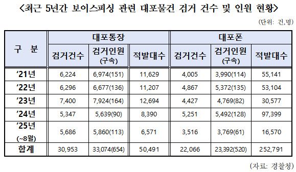 13일 국회 행정안전위원회 소속 한병도 더불어민주당 의원이 경찰청으로부터 제출받은 자료에 따르면, 최근 5년간 적발된 대포통장·대포폰 등 명의도용 물품은 총 30만 3282건에 달했다. 같은 기간 관련 범죄로 검거된 인원은 총 5만 6466명이고 이 중 1174명은 구속됐다.