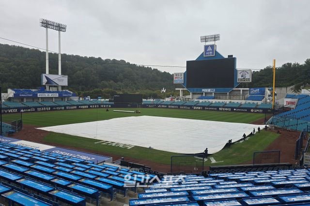 대구에 또 부슬비가 내리기 시작했다. 방수포도 깔렸다. '약한 비' 예보가 계속 있는 상황. 준플레이오프 3차전은 정상 개시될까.