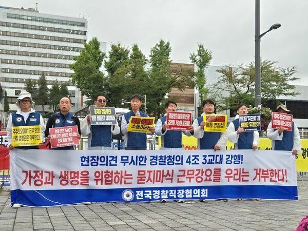 뉴시스 보도에 따르면, 경찰직협은 13일 오후 서울 용산구 대통령실 앞에서 기자회견을 열고 "경찰청은 인력 충원 없는 4조3교대 근무제를 일방적으로 강행하고 있다"며 "현장 대응력을 약화하고 경찰관의 건강권을 침해하는 무책임한 결정"이라고 비판했다.
