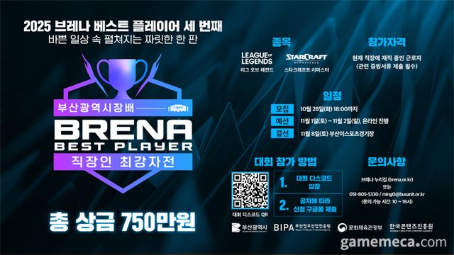 부산시와 부산정보산업진흥원이 오는 11월 8일 부산 e스포츠 경기장(이하 브레나)에서 '2025 브레나 베스트 플레이어' 직장인부 대회를 개최한다.
