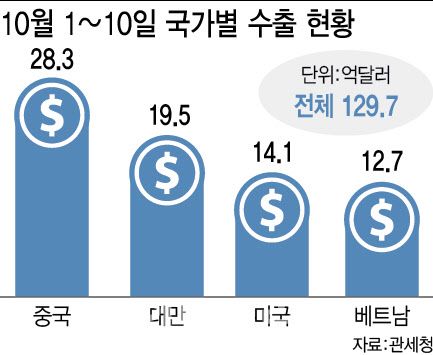 대미 수출 부진은 일시적으로 국가별 순위 변화로도 이어졌다. 미국은 중국과 양강 구도 속 줄곧 2위 수출시장을 유지해 왔는데, 이달 1~10일에 한해 중국-대만에 이은 3위로 내려앉았다.