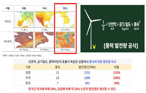 이어 강 위원장은 “바람이 풍부한 유럽에는 해상풍력을 (kWh당) 500원 정도로 판매하지만 우리나라는 유럽과 미국에 비해 각각 25%, 34% 수준의 풍력 발전량에 그친다”며 “이 때문에 우리나라에서는 재생에너지를 (kWh당) 700~800원으로 공급할 텐데, (이같은 비싼 전기요금이 현실화되면) 포항제철(현 포스코) 등을 비롯한 철강과 석유화학 등이 모두 붕괴될 것”이라고 우려했다.