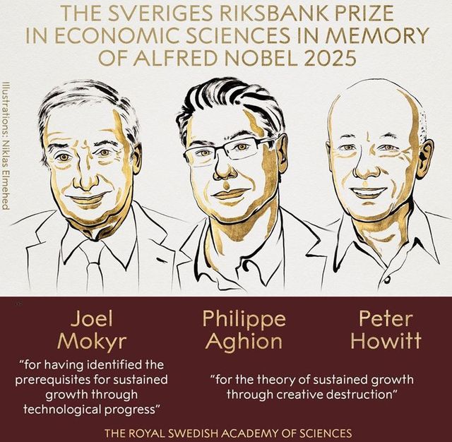 2025년 노벨경제학상은 ‘신기술을 통한 지속가능 성장’ 연구에 기여한 경제학자 3인에게 돌아갔다.