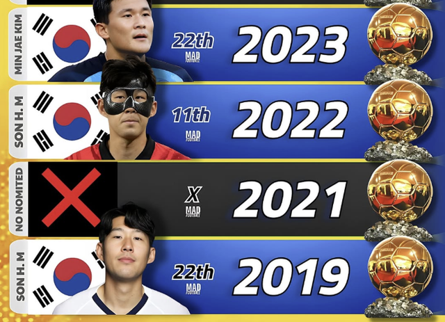 매체가 게시한 내용에 따르면 2019년부터 2025년까지 발롱도르 후보에 오른 아시아 선수는 2019년과 2022년 손흥민, 2023년 김민재 둘 뿐이다.
