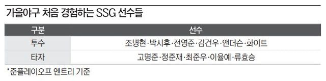 SSG의 준플레이오프(준PO·5전 3승제) 엔트리에는 PS 첫 등록 선수가 11명 포함됐다. 외국인 선수인 드류 앤더슨·미치 화이트를 제외하더라도 무려 9명의 국내 선수가 가을야구 데뷔전을 치르고 있는 셈이다. 포수 이율예는 구단 역사상 PS 엔트리에 이름을 올린 첫 번째 고졸 신인 야수로 스포트라이트를 받기도 했다.