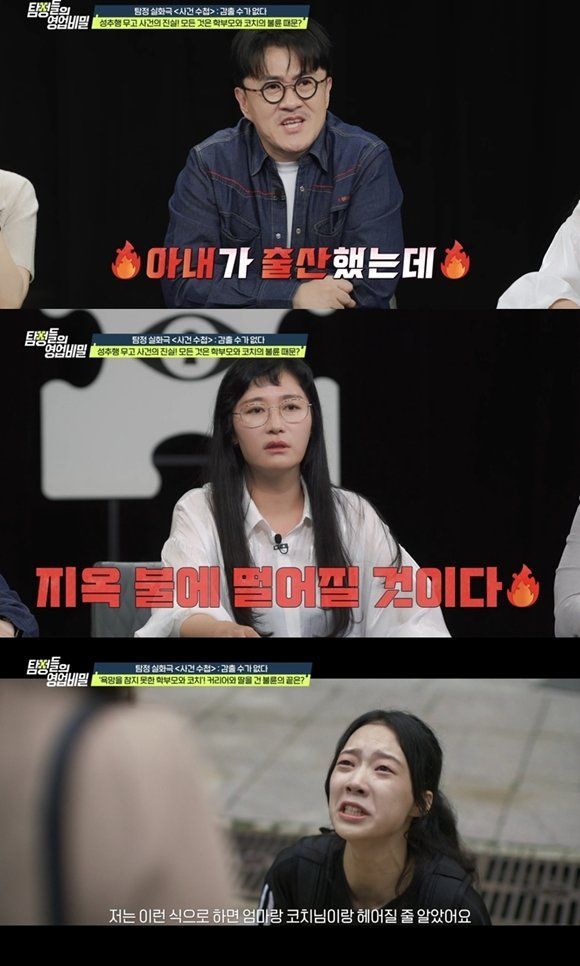 알고 보니 이 모든 건 코치인 의뢰인의 남편과 엄마의 불륜을 알게 된 제자가, 이를 멈추기 위해 벌인 자작극이었다. 더 기가 막힌 건 불륜이 들통난 뒤에도 엄마는 “딸을 지방 기숙학교로 보내면 눈치 안 보고 만날 수 있다”며 막장 발언까지 쏟아냈다. 이에 김미려는 “지옥불에 떨어질 것”이라며 격분했고, 김풍은 “엄마가 악귀 같다”며 경악했다. 데프콘은 의뢰인의 남편을 향해 “아내가 출산했는데 이 XX아, 집에서 학부모랑 불륜을 해?”라며 분노의 일침을 날렸다. 결국 제자는 운동을 그만두고 엄마와 멀리 떠났고, 의뢰인은 이혼을 택했다.