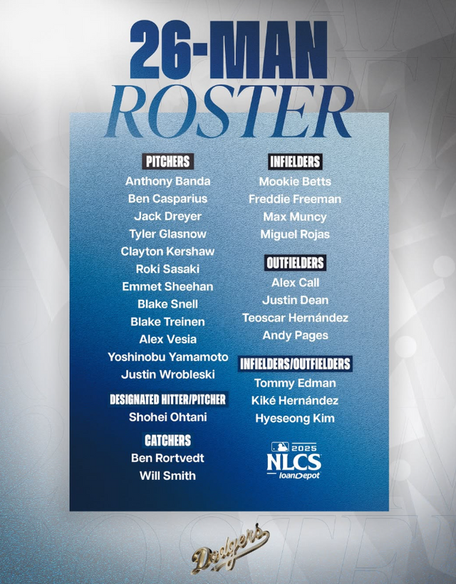 다저스는 14일(한국시간) 밀워키 브루어스와의 NLCS 경기에 나갈 선수 26명 명단을 발표했다. 김혜성은 올해 '가을 야구'에서 와일드카드 시리즈와 디비전시리즈에 이어 리그 CS에서도 엔트리에 포함됐다. 다저스는 주전 포수 윌 스미스가 부상에서 완전히 회복하면서 포수 엔트리를 기존 3명에서 백업 벤 로트벳을 포함한 2명으로 줄였다.