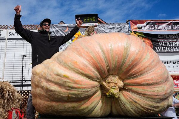 미국 캘리포니아주에서 해마다 열리는 연례 최대 호박 경진대회 행사에서 캘리포니아의 엔지니어로 거대 호박 키우기를 취미로 갖고 있는 브랜든 도슨의 1064kg( 2346파운드) 짜리 거대 호박이 13일 (현지시간) 우승을 차지했다.