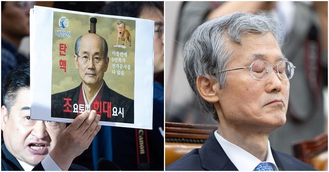 그러면서 "같은 시각, 국회 법사위 대법원 국감장에서는 민주당이 비례위성정당(새진보연합)으로 국회에 입성시킨 최혁진 의원이 조 대법원장을 도요토미 히데요시에 합성한 '조요토미 희대요시' 이미지 패널을 들어 보였다"며 "그러나 민주당 의원들은 이 같은 모욕적 행위에 별다른 제지를 하지 않았다"고 비판했다. 범여권 의원들이 2곳 국감장에서 보인 상반된 모습을 대비시켜 꼬집은 것.