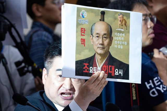 최혁진 무소속 의원이 13일, 서울 여의도 국회에서 열린 법제사법위원회의 대법원 국정감사에서 조희대 대법원장에게 질의하며 '조요토미 희대요시'라고 적힌 사진을 들어 보이고 있다. / 뉴스1