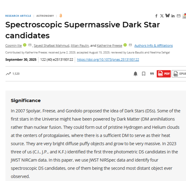 일리에 교수는 "신호 대 잡음비가 높지는 않지만, 다크스타의 실존을 암시하는 첫 '스모킹 건(smoking gun)'이라 할 만하다"며 "이번 관측은 암흑물질 연구의 방향을 새롭게 제시할 것"이라고 말했다.