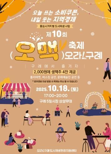 [파이낸셜경제=김영란 기자] 전남 구례군은 오는 10월 18일 오후 5시부터 8시까지 구례읍 5일시장 상설무대 일원에서 '제10회 오맥축제 오라! 구례, 구례에서 즐기자'를 개최한다고 밝혔다.