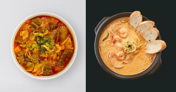 CJ프레시웨이의 조리 효율화 상품으로 조리한 프랜차이즈 메뉴 '샐러리아 마녀스프', '다다하다 새우로제짬뽕탕'