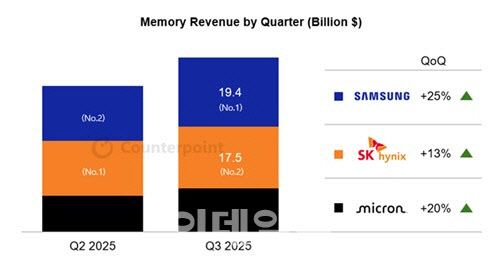 14일 글로벌 시장조사업체 카운터포인트리서치에 따르면 삼성전자는 3분기 D램과 낸드 플래시를 포함한 전체 메모리 시장에서 194억달러(약 27조6700억원)의 매출을 기록했다. SK하이닉스는 175억달러(약 24조9600억원)를 달성했다. 삼성전자와 SK하이닉스 매출은 전 분기 대비 각각 25%, 13% 늘었다.