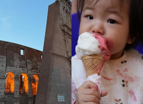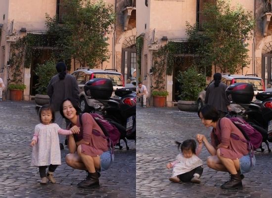 사진 속에는 20개월 된 딸과 로마의 거리를 걸으며 오래된 도시의 풍경과 선선한 가을 날씨를 만끽하는 윤진서의 모습이 담겨 있다. 젤라또를 얼굴에 묻히며 열심히 먹는 딸의 귀여운 자태도 미소를 자아낸다.