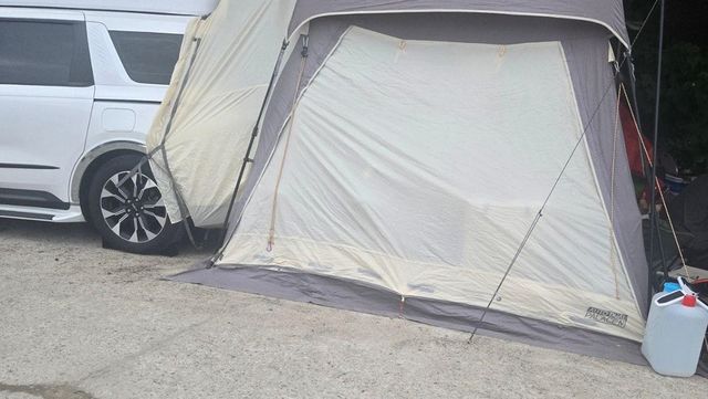 차량과 연결된 텐트를 콘크리트에 박은 못과 연결한 모습. / 보배드림