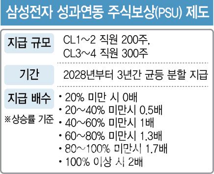 삼성전자는 또 중장기 성과에 대한 임직원들의 동기 부여를 위해 성과연동 주식보상(PSU) 제도를 단행하기로 했다. 회사의 주가가 많이 오를수록 임직원 보상 규모가 비례해서 커지는 구조다. 예컨대 기준 주가가 8만5000원이라고 할 때 3년 후 주가가 두 배 오르면 과장·차장·부장급에 해당하는 CL(직급 레벨) 3~4급 직원은 향후 3년간 1억원어치 이상의 주식을 받을 수 있는 식이다. 이 역시 이 회장이 통 큰 결단을 내린 것이다.