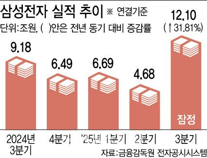 삼성전자(005930)는 올해 3분기 연결기준 영업이익 12조 1000억원을 기록하며 전년 동기 대비 31.81% 증가했다고 14일 공시했다. 시장 컨센서스(증권사 실적 전망치)인 10조 1923억원을 무려 18.7%를 상회하는 ‘어닝 서프라이즈’다. 매출은 역대 최대 분기 매출인 86조원으로, 전년 동기 대비 8.72% 증가했다.