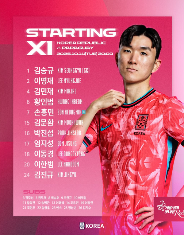 이날 김승규, 김문환, 김민재, 이명재, 이한범, 김진규, 박진섭, 엄지성, 이동경, 황인범, 손흥민이 선발 출격한다. 송범근, 조현우, 김주성, 김지수, 설영우, 이태석, 조유민, 백승호, 옌스 카스트로프, 원두재, 이강인, 이재성, 정상빈, 오현규, 황희찬은 벤치 대기한다.