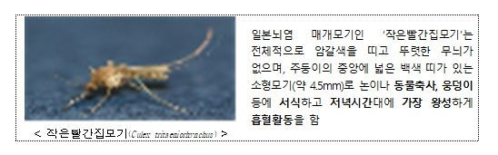 일본뇌염 매개모기인 작은빨간집모기는 암갈색 소형 모기로 주로 야간에 흡혈활동을 하고, 우리나라 전 지역에서 10월까지 활동하는 것으로 관찰된다. 일본뇌염 매개모기 감시 결과 9월말 기준(39주차) 평균 108개체로 지속적으로 발생하고 있으므로, 모기 물림에 주의하고, 증상 발현 시 신속하게 의료기관을 방문하여 진단 및 치료를 받아야 한다.
