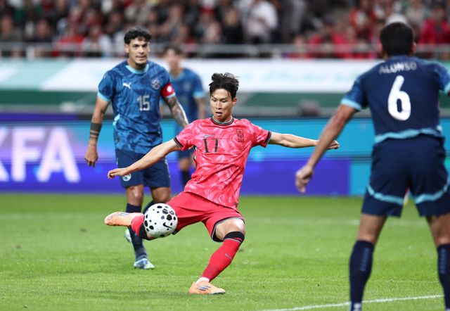 이날 홍명보호는 또 한 번 스리백을 꺼내 들고 파라과이를 전반부터 강하게 압박했다. 하지만 슈팅이 좀체 나오지 않았는데, 전반 15분 나온 엄지성의 첫 슈팅이 득점으로 이어졌다.