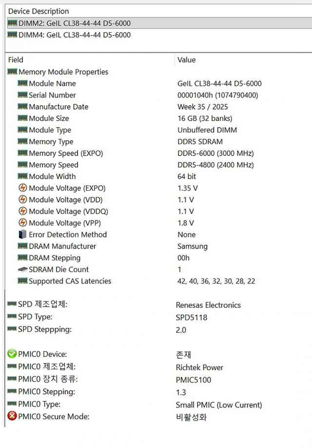 ▲ 모듈은 삼성(Samsung) DRAM을 사용했으며, 제조 시점은 2025년 35주차 생산분이다. DRAM 스테핑은 00h, 단일 1Die(1칩 구성)로 확인되며, 이는 고수율·저전력 특성을 지닌 최신 B-다이 기반으로 추정된다. 온다이 ECC(On-die Error Correction Code) 구조가 탑재되어 데이터 전송 중 발생할 수 있는 비트 오류를 실시간으로 보정하며, 장시간 동작 시에도 메모리 무결성을 확보한다. AI 연산 및 대용량 워크로드 환경에서의 신뢰성과 지속적인 성능 유지에 초점을 둔 설계로 평가된다.