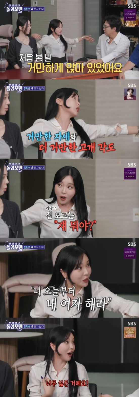 홍진영은 "그 자세로 저를 보더니 '쟤 뭐야?'라고 하더라. 저를 모를 수가 없는 상황이었다. 누가봐도 홍진영이었는데, 너무 기분이 나빴다"고 전했다. 이어 "그런데 더 싫었던 건 저한테 '오늘부터 내 여자해라'라고 하더라. 진짜로 그렇게 말했다. 너무 싫었다"고 질색해 웃음을 자아냈다.