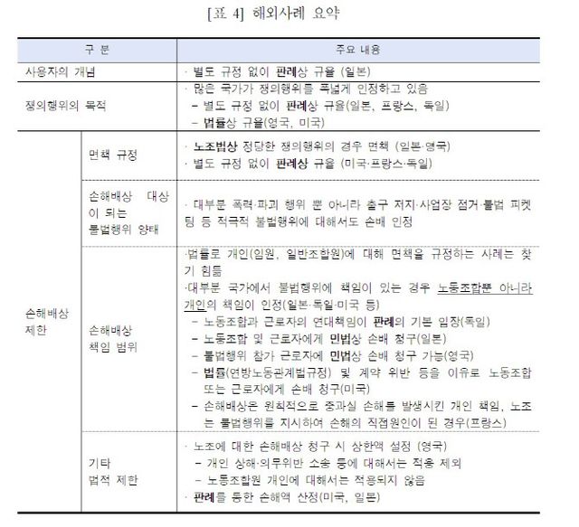 보고서에 따르면, 한국과 같이 대륙법 국가(성문법 중심)로 분류되는 일본·독일·프랑스는 우리나라와 마찬가지로 적법한 쟁의행위에는 면책조항이 있으나 불법행위에 대한 면책조항은 없다.