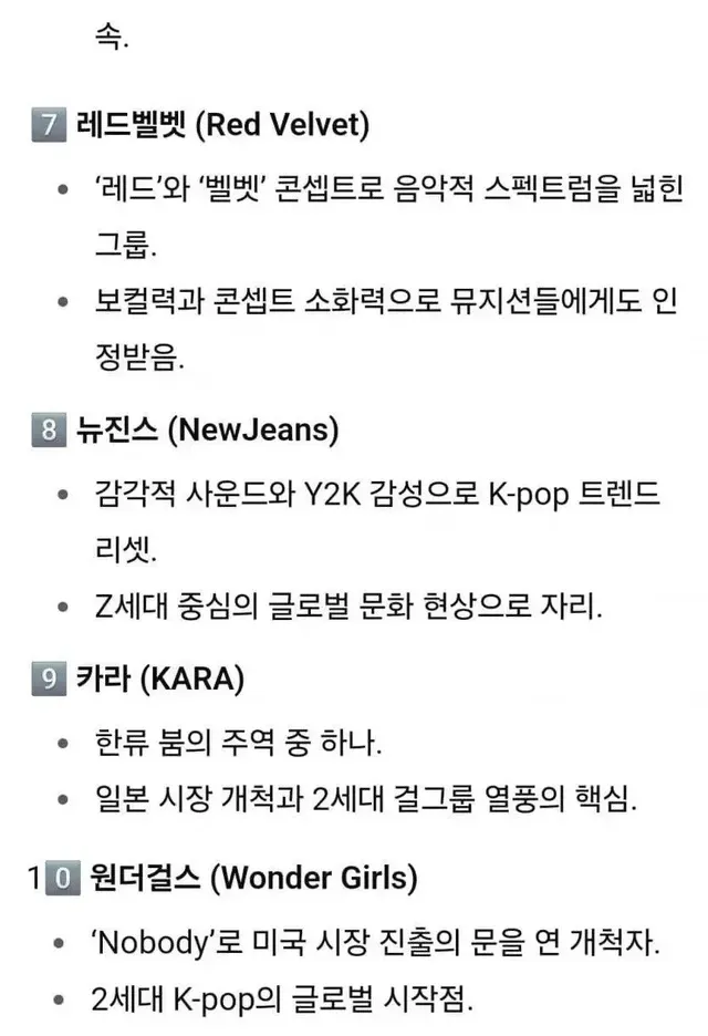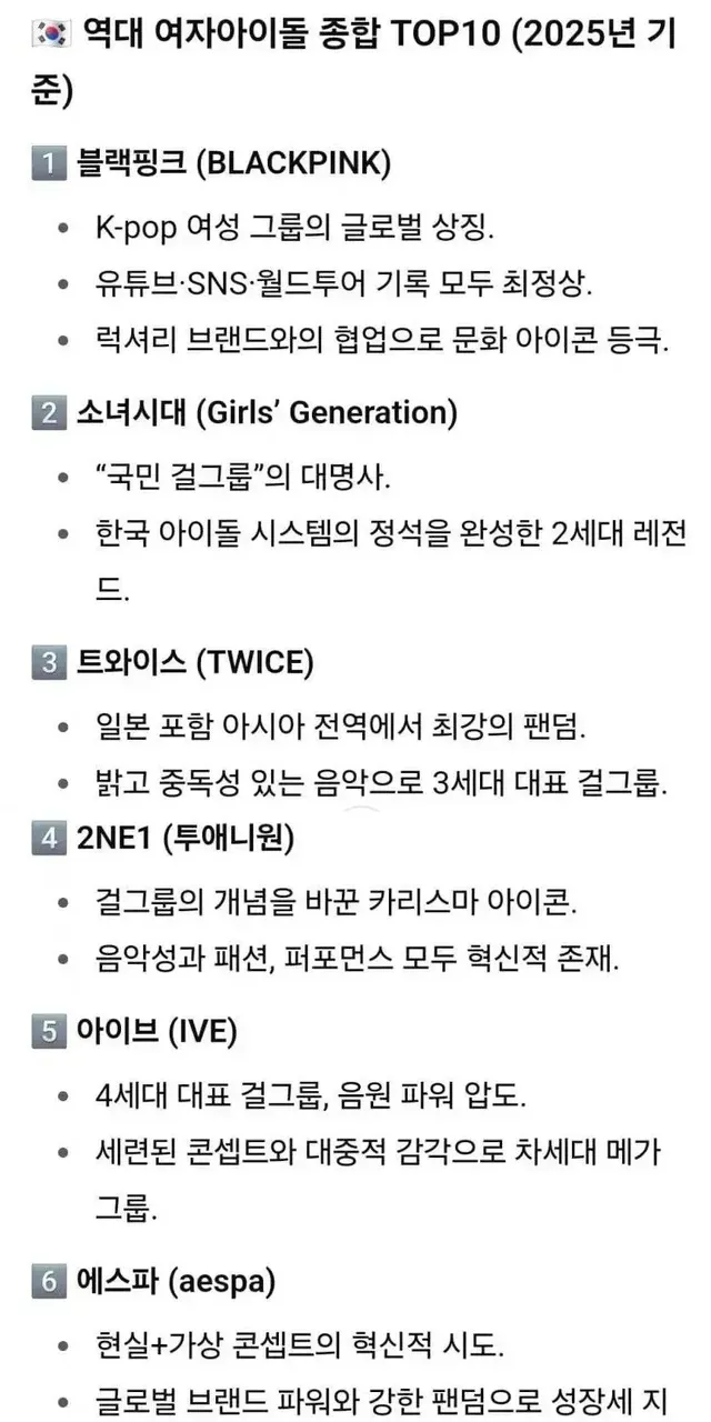 챗GPT가 선정한 역대 남녀 아이돌그룹 TOP10,,