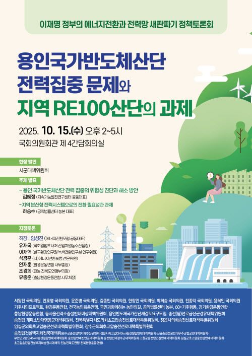 국회는 15일 오후 2시 국회의원회관 제 4간담회의실에서 이재명 정부의 에너지전환과 전력망 새판짜기 정책토론회 일환으로 ‘용인 국가반도체산단 대규모 전력 집중 문제와 지역 RE100산단의 과제’ 주제의 정책토론회를 개최한다. 더불어민주당 안호영·윤준병·이원택·박희승, 조국혁신당 서왕진·차규근, 사회민주당 한창민, 진보당 전종덕, 기본소득당 용혜인, 무소속 김종민 의원과 환경운동연합, 전국농민회총연맹, 동서울전력소증설반대비상대책위원회, 기후시민프로젝트, 공익법률센터 농본 및 전북·충남·전남·경기도 송변전시설 지역대책위원회 등이 공동 주최하는 토론회다.
