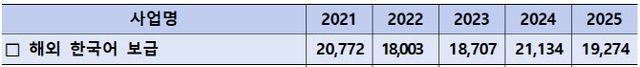 문제는 급증하는 한국어 교육 수요에도 불구, 관련 예산은 축소됐다는 점이다. 해외 한국어 보급 사업 예산은 2021년 약 208억 원에서 2025년 193억 원을 감소했다. 해외 한국어 교원 파견 역시 올해 77명으로 전년도 102명 대비 25명 줄었다.