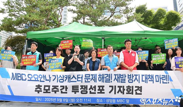 오늘(15일) 오전 10시 서울 마포구 상암동 MBC 본사에서는 안형준 사장과 고(故) 오요안나 유족이 함께하는 기자회견이 열렸다. 현장에서는 故 오요안나 모친 장연미 씨와 MBC 관계자들이 자리했다.