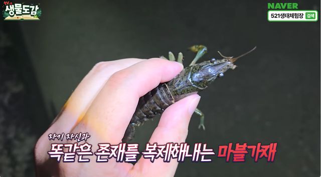 생물도감은 경기도 이천시 죽당천, 일명 구피천을 탐사하던 중 마블가재를 연이어 목격했다. 그는 "오늘만 벌써 4마리 봤거든요"라며 "이게 구피천이 숨을 데가 엄청 많아요. 그래서 이거 최소한 몇백 마리, 몇백 마리가 뭐야? 몇천 마리는 있을 것 같은데"라고 말했다.