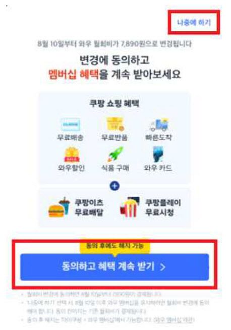구체적으로 쿠팡은 쇼핑몰 앱 초기 화면 팝업창에서 가격 인상에 즉시 동의한다는 내용의 ‘동의하고 혜택 계속 받기’ 버튼을 소비자가 쉽게 인지할 수 있도록 중앙 하단에 청색 바탕 버튼으로 크게 제시한 반면, 가격 인상 동의를 유보하는 내용의 ‘나중에 하기’ 버튼은 소비자가 인지하기 어렵게 우측 상단에 백색 바탕 버튼으로 축소해 제시했다.