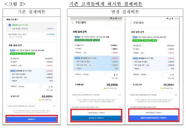 또한 쿠팡은 소비자들이 상품을 구매할 때마다 상품대금 결제단계에서 항상 클릭했을 결제버튼을 시각적으로 같은 크기·색상으로 유지한 채 결제버튼에 표시되는 문구를 기존 ‘결제하기’에서 ‘(가격인상에) 동의하고 구매하기’ 또는 ‘월회비 변경에 동의하고 구매하기’ 등 가격인상에 동의를 구하는 문구를 제시했다. 가격 인상 동의를 유보하는 ‘나중에 결정하고 구매하기’ 버튼의 경우 상대적으로 인지하기 어렵게 버튼 색상을 배경과 동일한 백색으로 표시했다.