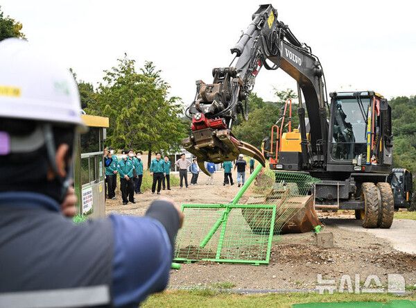 파크골프장 입구에 설치된 10여m의 철제 펜스는 굴착기가 몇 차례 바구니(버킷) 달린 팔을 휘젓자 힘없이 무너졌다. 굴착기는 철제 펜스를 철거한 뒤 곧장 파크골프장 잔디 필드로 진입했다.
