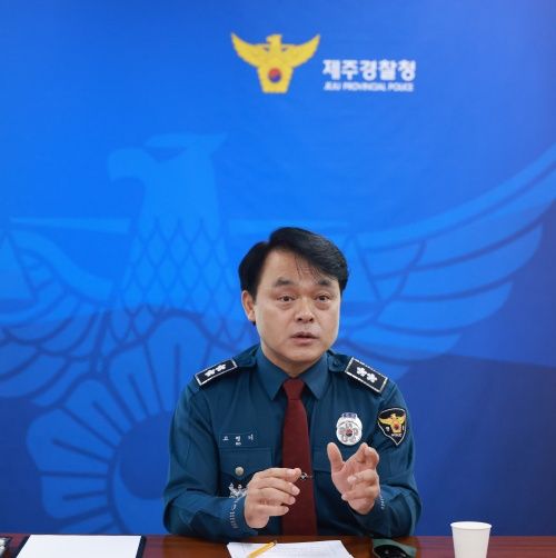 고평기 제주경찰청장이 15일 청 기자실에서 취임 후 첫 기자간담회를 갖고 캄보디아발 감금·폭행 등에 대한 수사 상활을 설명하고 있다. 제주경찰청 제공