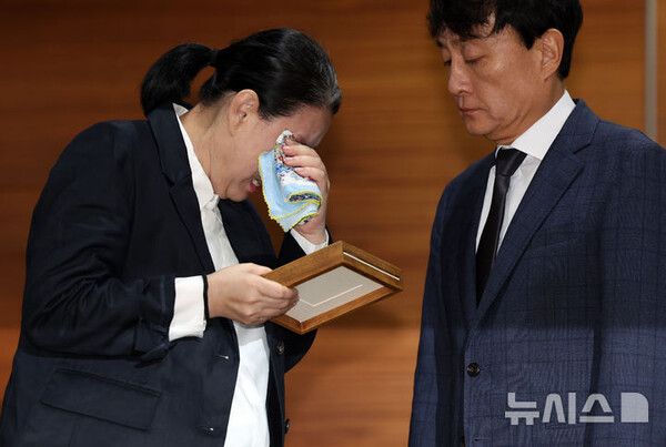 이날 기자회견 전 참석자들은 고인을 추모하며 묵념의 시간을 가졌다. 안 사장과 장씨는 합의서에 서명했다. 장씨는 고인의 명예사원증을 받고 눈물을 쏟았다. 안 사장은 장씨와 포옹하며 위로를 건넸다.