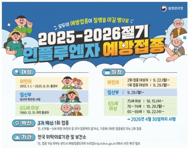 질병관리청은 올해 ‘2025~2026절기’ 인플루엔자 및 코로나19 예방접종을 이날부터 시작한다고 밝혔다.