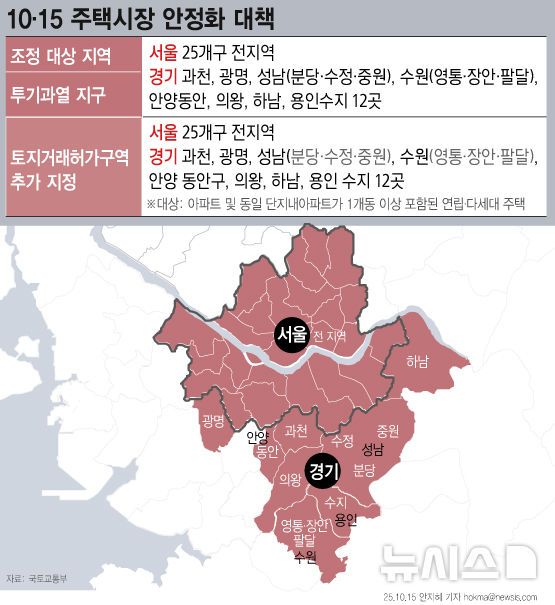 정부가 서울 전역을 비롯해 과천·성남 등 경기도 일부 지역을 조정대상지역 및 투기과열지구, 토지거래허가구역으로 묶는 초강력 규제 대책을 내놨다. 이재명 정부 출범 후 6·27 대출규제와 9·7 주택공급 대책에 이어 이번이 세 번째다.