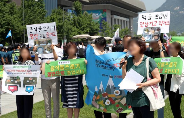 자원순환 사회연대, 한국환경회의 회원들이 과거 서울 세종대로 광화문광장에서 '대국민 음식물쓰레기 감량촉구 기자회견' 하는 모습. 자료사진. / 뉴스1