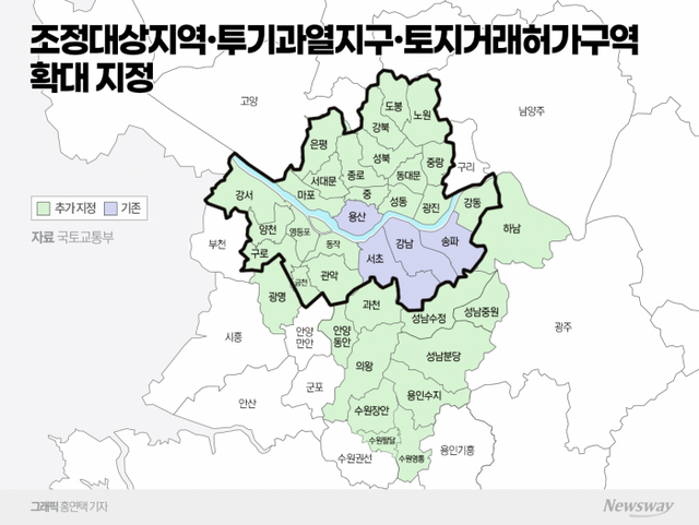 정부는 15일 발표한 '주택시장 안정화 대책'을 통해 기존 규제지역인 강남·서초·송파·용산구에 더해 서울의 나머지 21개 구도 조정대상지역, 투기과열지구, 토지거래허가구역으로 지정했다. 수도권 주요 지역인 과천, 성남 분당·중원·수정, 광명, 수원, 안양, 용인, 하남 등 12곳도 포함됐다.