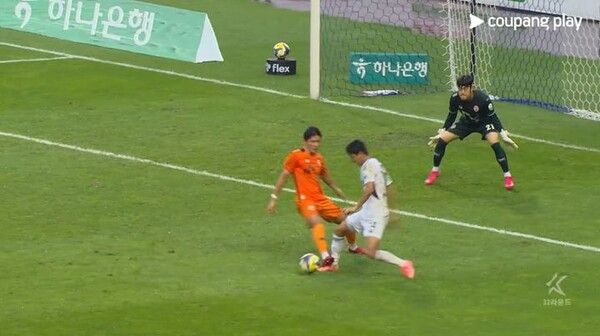 느린 속도로 돌려봤을 때 장민규의 발은 전진우의 발목을 가격해 명백한 반칙이었다.