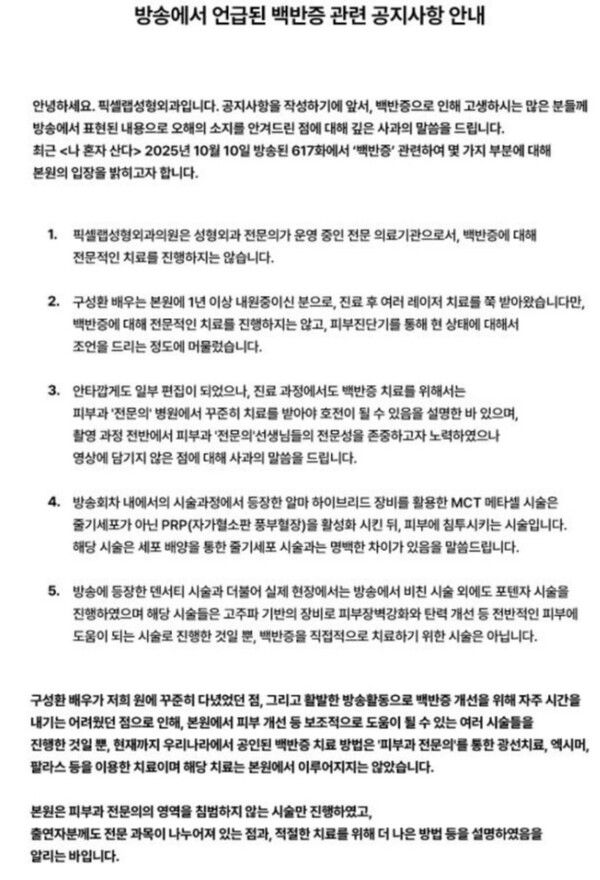 [메디먼트뉴스 정원욱 기자] 배우 구성환이 MBC '나 혼자 산다'에서 난치성 피부병 '백반증' 투병 사실을 공개한 가운데, 그가 찾았던 A성형외과 측이 방송 내용과 관련해 공식 입장을 밝혔다. 병원 측은 백반증에 대한 전문적인 치료를 진행하지 않으며, 방송에서 언급된 시술에 대한 오해 소지에 대해 사과했다.