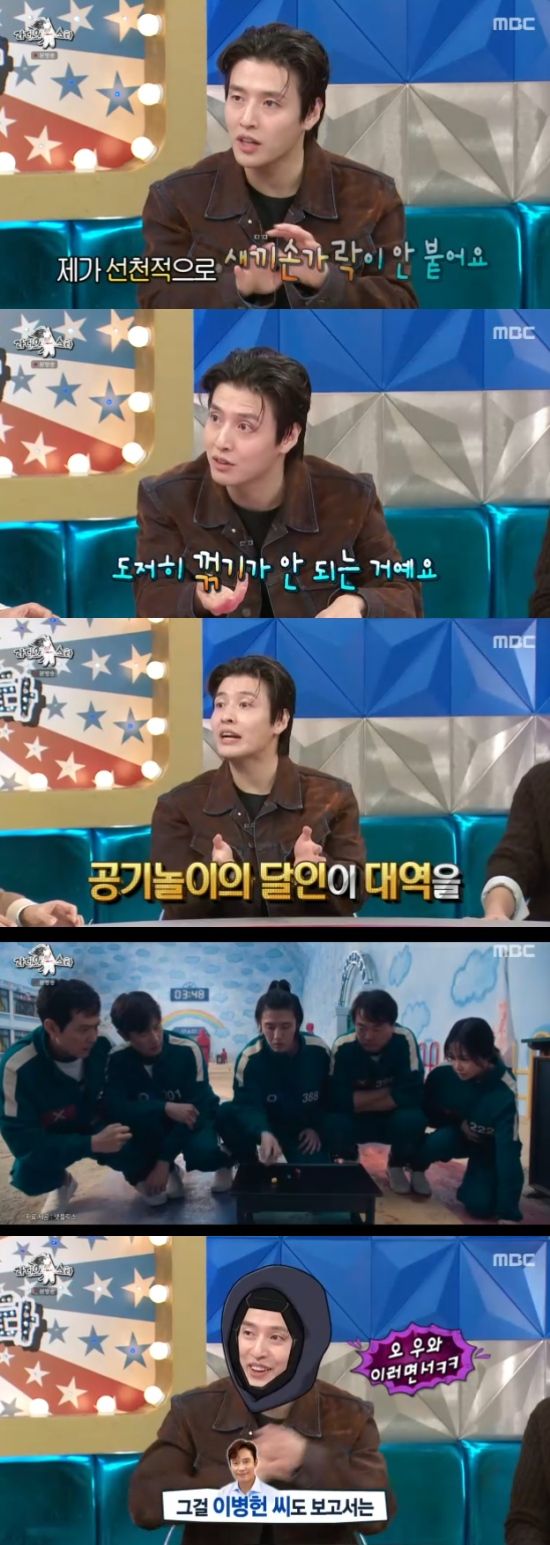 이날 방송에서 강하늘은 '오징어게임'을 언급하면서 "공기를 하던 손은 대역이다. 제가 선천적으로 새끼 손가락이 안 붙는다. 엄청 열심히 연습을 했는데, 직접 안해도 된다고 하시더라"고 했다.