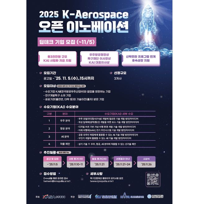 [엠투데이 이정근기자] KAI(한국항공우주산업㈜)가 "2025 K-Aerospace 오픈 이노베이션"에 공동 주관기관이자 수요기업으로 참여하여 딥테크 기업과 기술협력에 나선다.