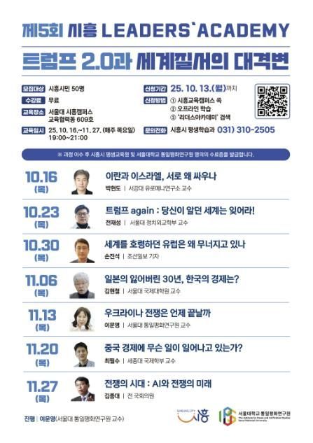 [와이뉴스] 시흥시는 서울대학교 본부 직속 연구기관인 통일평화연구원과 함께 '제5회 시흥리더스아카데미'를 10월 16일에 개강한다. 이번 아카데미는 '트럼프 2.0과 세계질서의 대격변'을 주제로 급변하는 국제 정세와 세계 질서의 흐름에 대한 시민들의 폭넓은 이해를 돕고자 마련됐다.