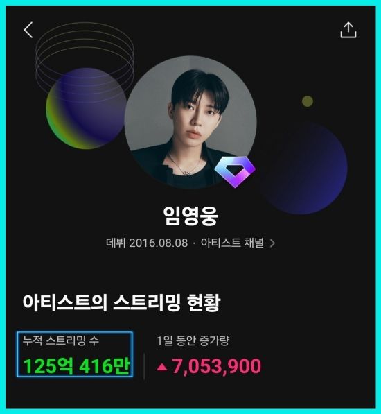 최근 임영웅은 음원사이트 멜론에서 누적 스트리밍 125억 회를 돌파했다.