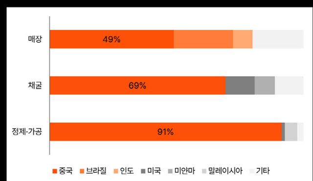 보고서는 중국이 희토류 공급망을 사실상 장악하고 있으며 한국도 전적으로 수입에 의존해 자원무기화의 영향권에서 자유롭지 않다고 지적했다. 미국 지질조사국(USGS)과 국제에너지기구(IEA) 등에 따르면 2024년 기준 중국의 희토류 생산량은 27만 톤으로 전세계 생산량의 69%를 차지하며 희토류 정제량에서는 90% 이상으로 절대적인 비중을 차지한다. 지난해 한국의 중국산 희토류 화합물과 금속 수입 비중은 각각 61%, 80%에 달했다. 수출통제가 지속되면 반도체·전기차·배터리 등 한국의 주력 수출 품목에 직접적인 타격이 우려된다.