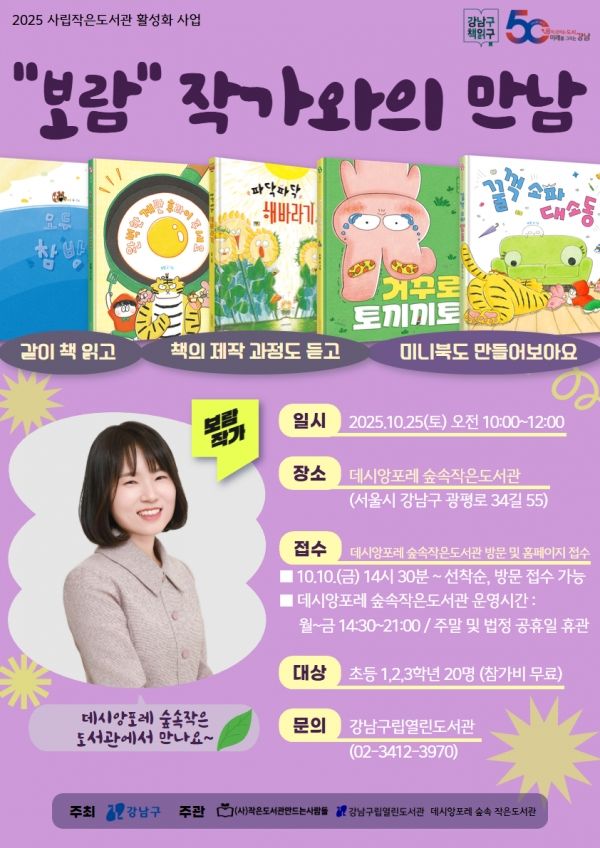 강남구립열린도서관은 2025 사립 작은도서관 활성화 사업의 일환으로, 데시앙포레 숲속작은도서관과 연계해 어린이 문화 프로그램 '보람 작가와의 만남'을 진행한다. 이번 행사는 아이들이 그림책을 더 깊이 이해하고 독서에 대한 흥미를 높일 수 있도록 기획됐다.